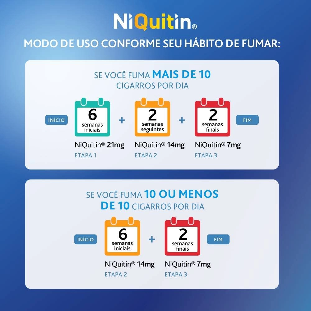 2ª etapa: NiQuitin Adesivo 14mg – usar os adesivos nas 6 semanas iniciais;